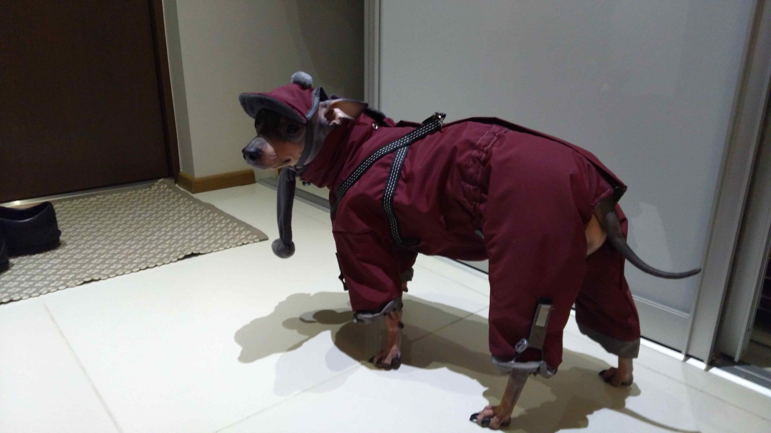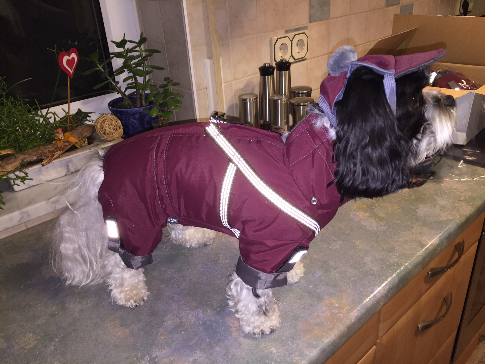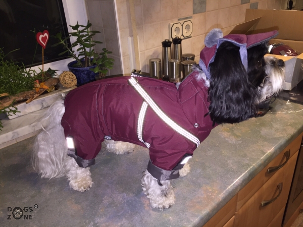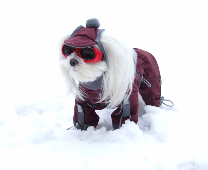 Das Mäntelchen ist super bei Schneewetter(verhindert die Schneeklumpen am Fell).