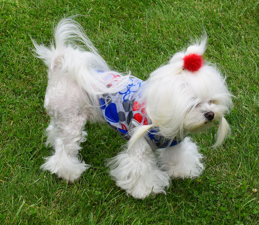 Bella-Malteser auf den Fotos trägt Gr.XS.Bella wiegt 2 kg und ist 22 cm lang,Nico wiegt 3 kg ist 27 cm lang und hat Gr.S an.