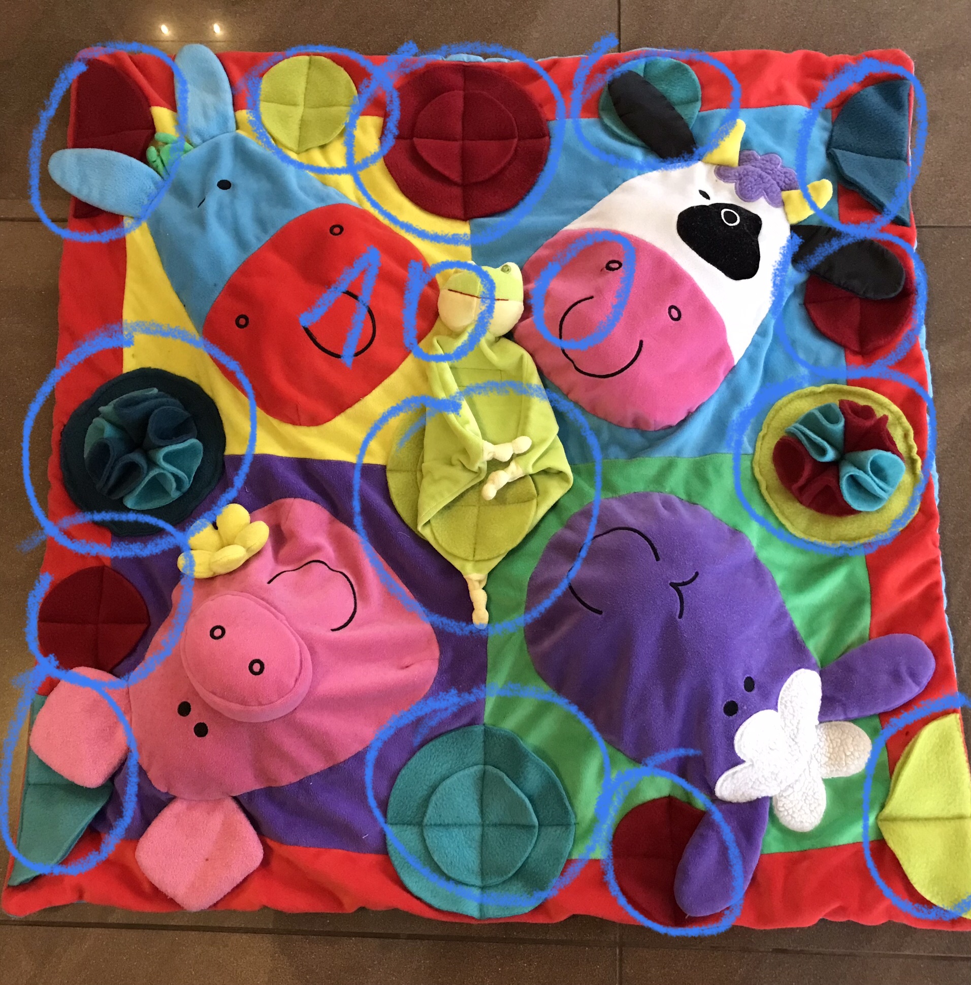 Jede Matte hat unterschiedliche Verstecke Leckerlis, siehe Foto mit den Markierungen. Die Spielmatte kann problemlos bei 30 Grad gewaschen werden. Bitte nicht in den Trockner tun.