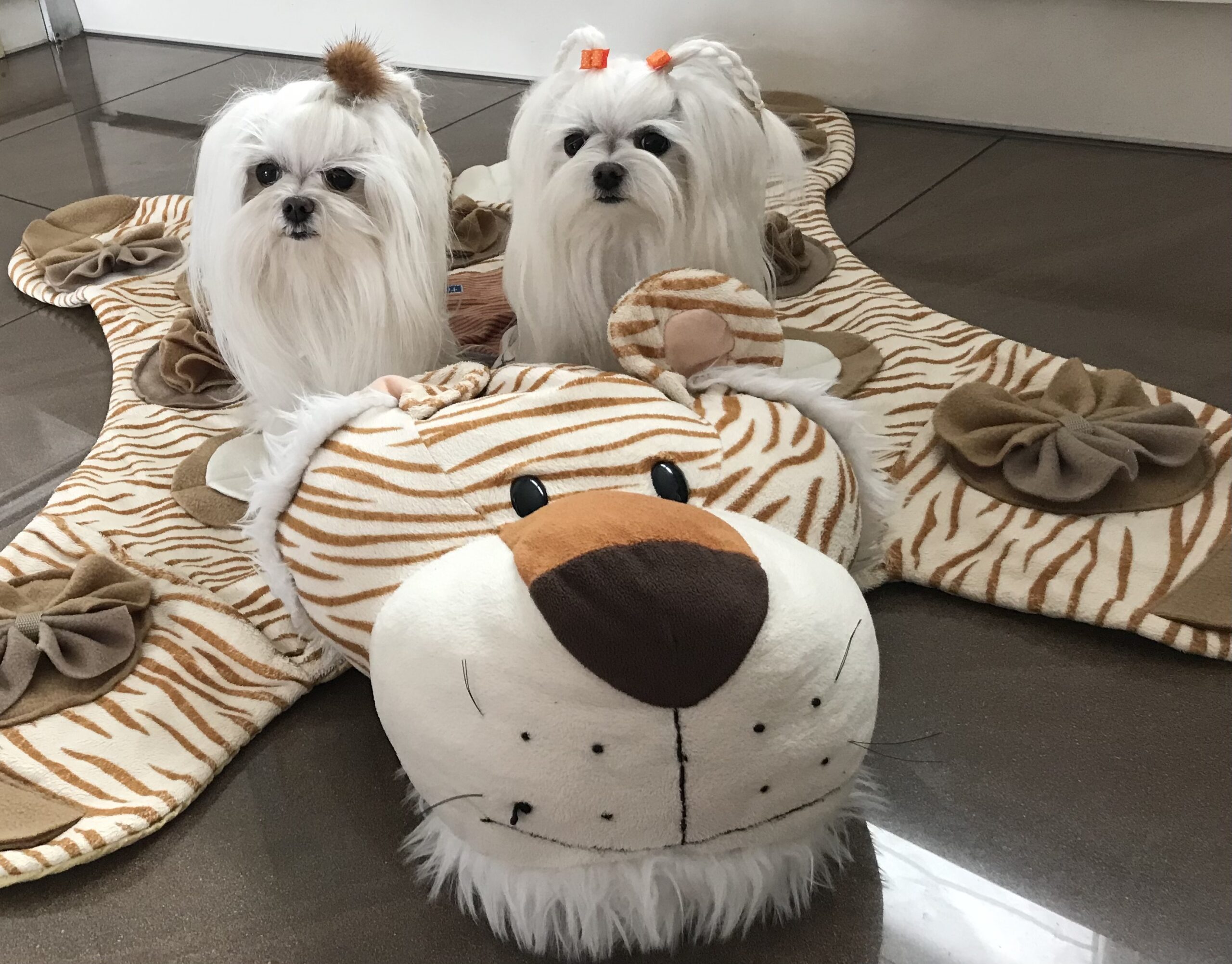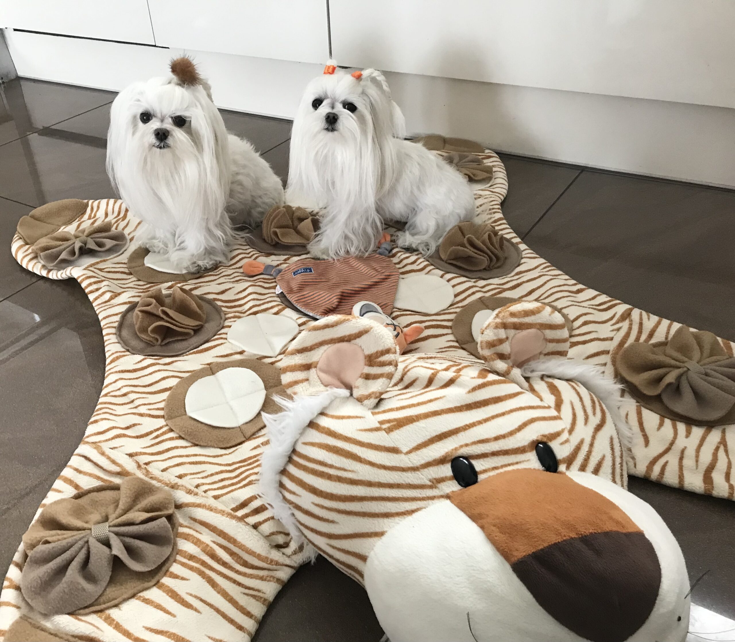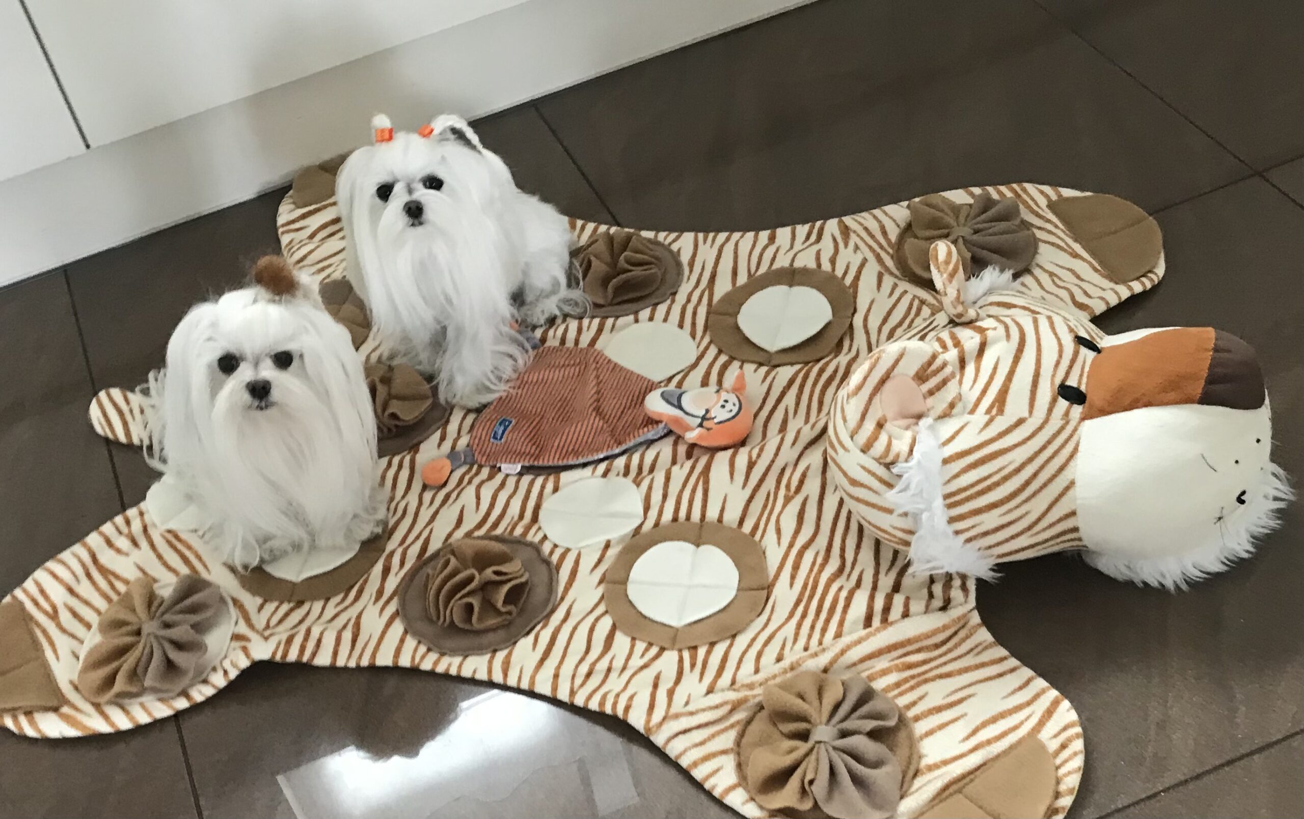 Wenn wir länger aus dem Haus gehen, befülle ich die Spielmatte mit Leckerlis – das beschäftigt die zwei eine Weile. Sie können auch Trockenfutter verstecken wenn der Hund z.B zu schnell aus der Schüssel frisst, wenn er sich mehr bewegen muss weil es zugenommen hat oder aber auch wenn er ein schlechter Esser ist wie meine Hunde – manchmal hilft das auch sehr gut.