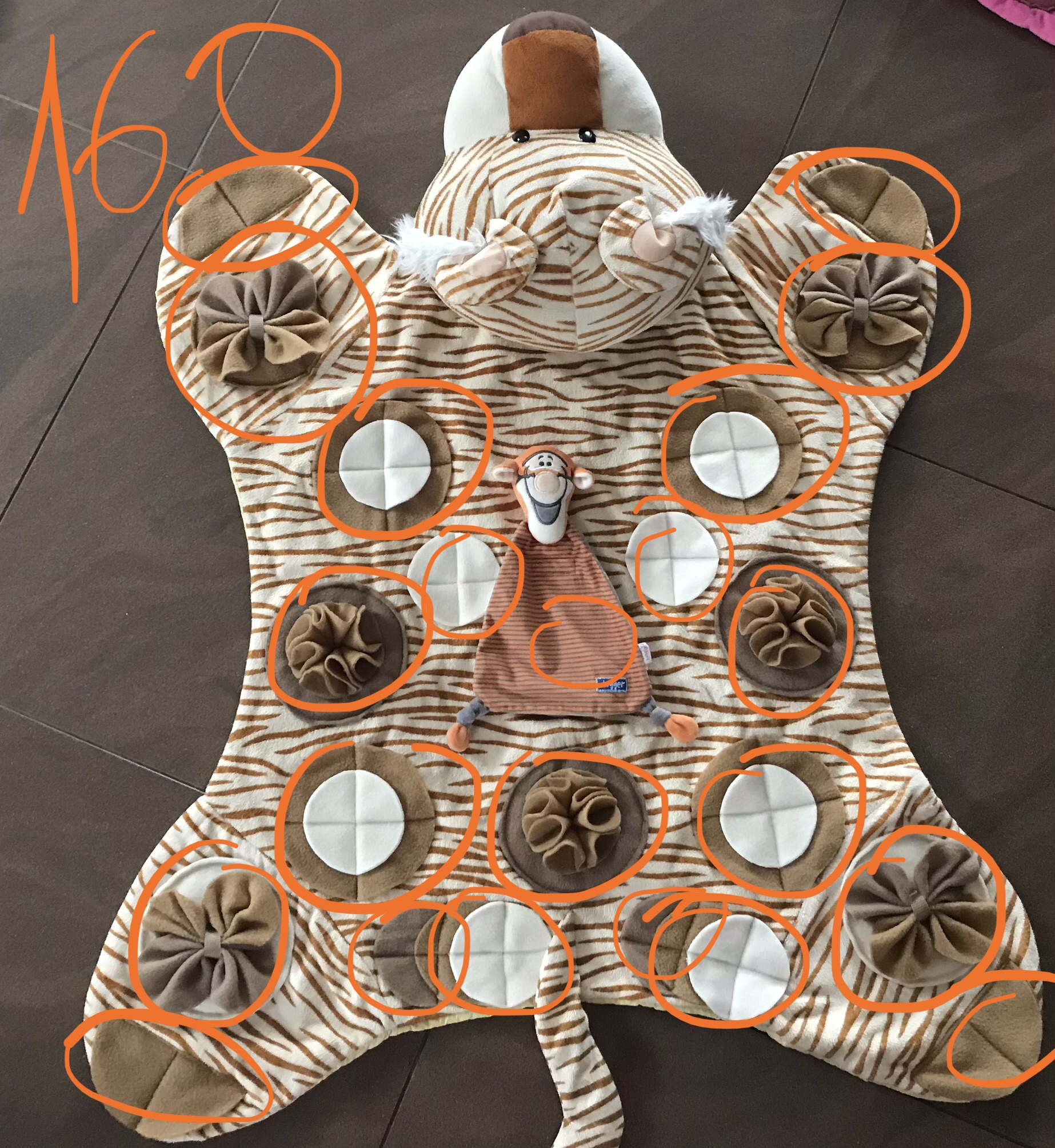 Jede Matte hat unterschiedliche Verstecke Leckerlis, siehe Foto mit den Markierungen. Zusätzlich hat die Matte noch ein abnehmbares Spielzeug zum Kuscheln und lieb haben. Es ist mit Klettverschluss befestigt, welcher bei Bedarf zugemacht bzw. abgedeckt werden kann, damit sich die Hunde die Nasse an dem Klettverschluss nicht aufreiben. Die Spielmatte kann problemlos bei 30 Grad gewaschen werden. Bitte nicht in den Trockner tun.